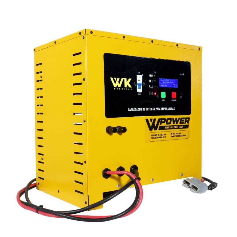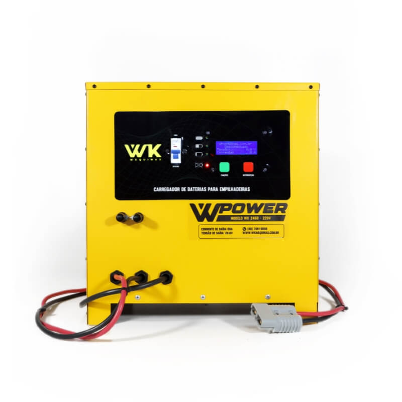 O Carregador de Bateria Estacionária / Tracionária 24V 60A WK é um equipamento projetado para a recarga de baterias do tipo chumbo-ácido utilizadas em empilhadeiras elétricas e aplicações industriais, assegurando fornecimento correto de corrente, proteção do conjunto e maior durabilidade das baterias.